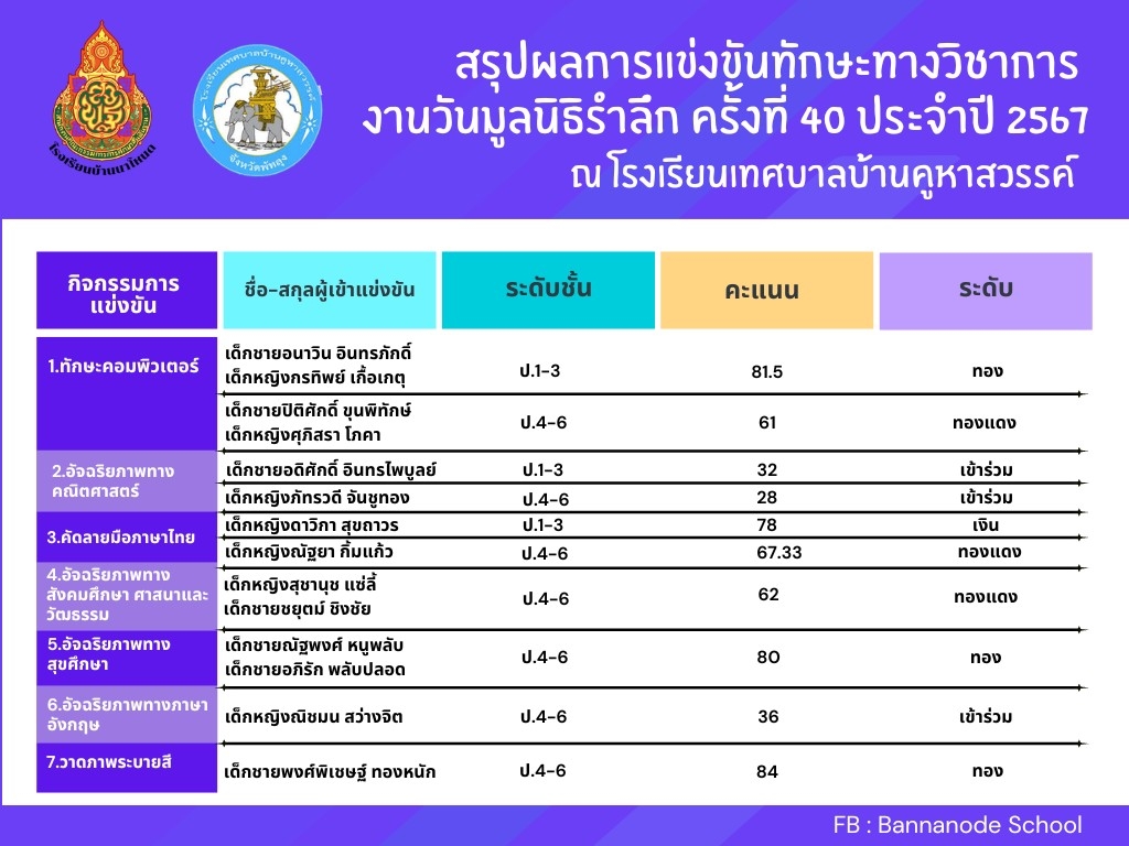 ขอชื่นชมและแสดงความยินดีกับนักเรียนโรงเรียนบ้านนาโหนดในการเข้าร่วมแข่งขันทักษะทางวิชาการ งานวันมูลนิธิ ณ โรงเรียเทศบาลบ้านคูหาสวรรค์