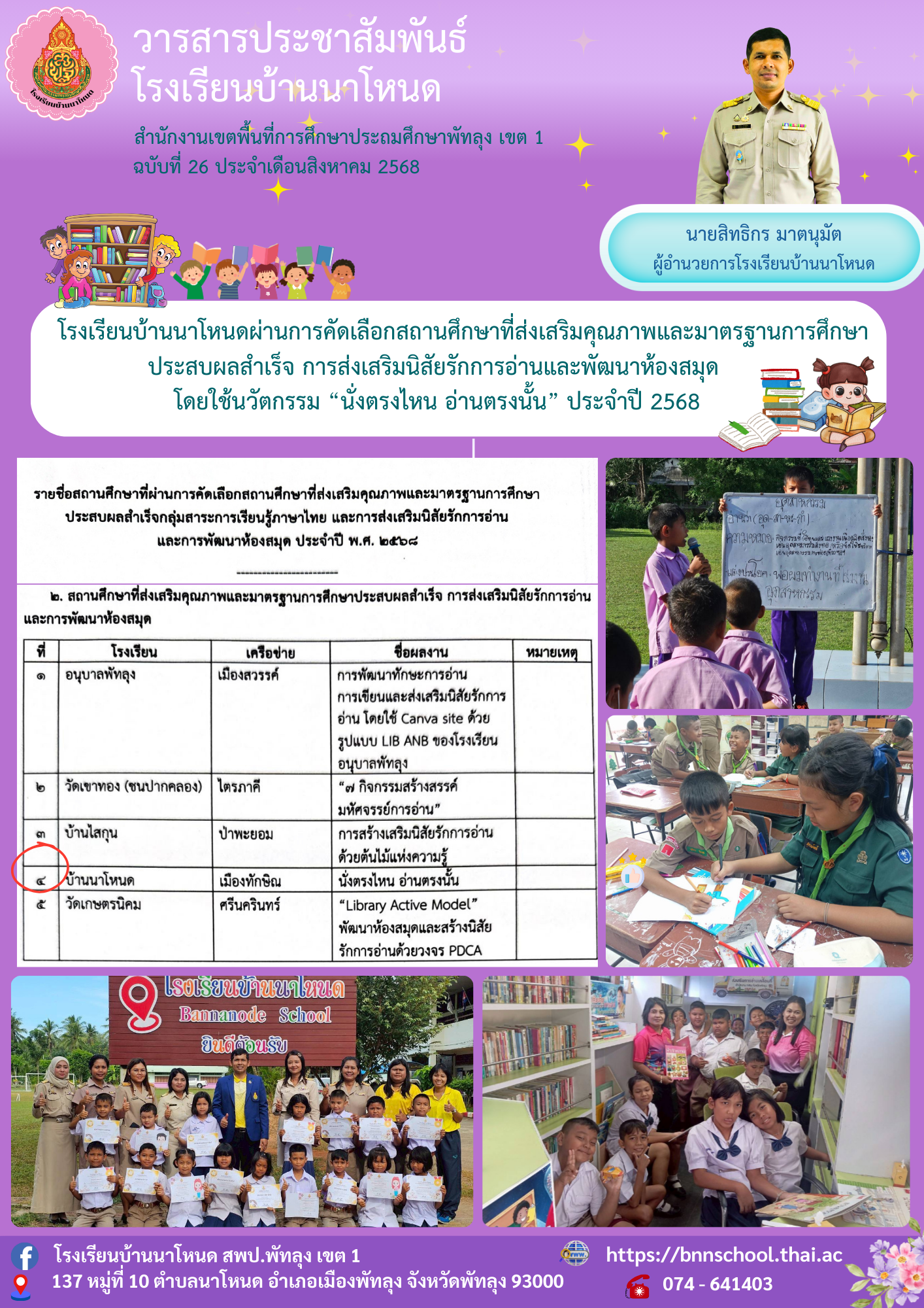 โรงเรียนบ้านนาโหนดผ่านการคัดเลือกสถานศึกษาที่ส่งเสริมคุณภาพและมาตรฐานการศึกษาประสบผลสำเร็จ การส่งเสริมนิสัยรักการอ่านและพัฒนาห้องสมุด ปี 2568